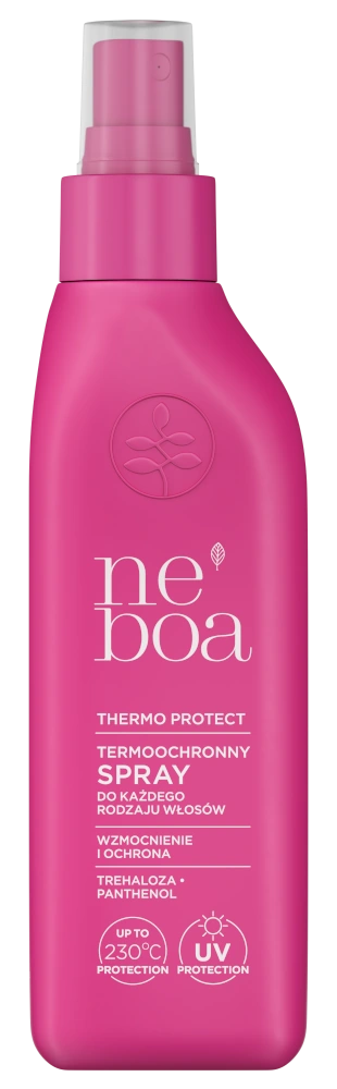 Termoochronny spray Neboa Thermo Protect tworzy na włosach delikatną tarczę, która chroni je przed przegrzaniem i utratą wilgoci.